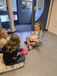 Tijdens de Kinderboekenweek werd er veel aandacht besteed aan boeken en verhalen. Iedere ochtend startten we de dag met een boek: de jongere kinderen waren één en al oor, terwijl de oudste kinderen aan hen mochten voorlezen!